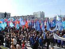 «НАТО – ні! Росії – так!» – на центральному майдані Сімферополя зібралися близько 5 тисяч осіб. Це активісти кримських відділень 10 політичних партії, а також працівники бюджетних організацій, привезені з районів, де висуванці Партії регіонів очолюють райдержадміністрації.
