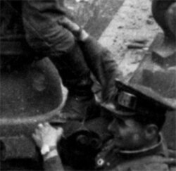 Фрагмент з оригінальної фотографій Халдея де видно два годинники на руці радянського офіцера