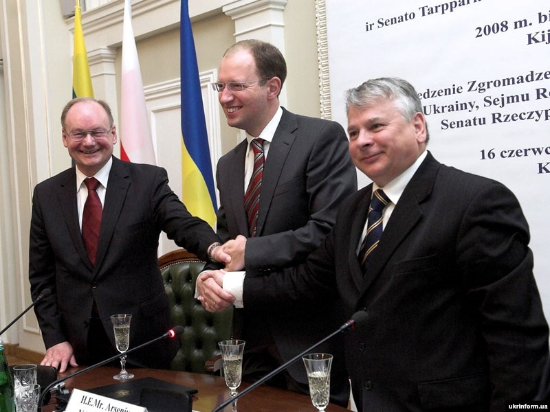 На фото: (зліва направо) Голова Сейму Литовської Республіки Чесловас Юршенас, Голова Верховної Ради України Арсеній Яценюк, маршалок Сенату Республіки Польща Богдан Борусевич. Київ, 16 червня 2008 р.