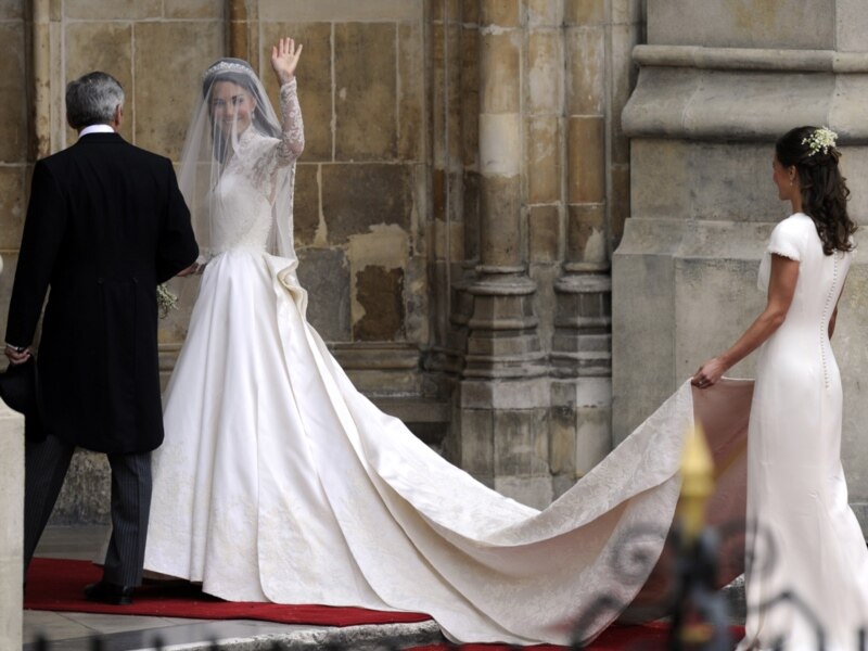 Це ім’я, а точніше, імена британських дизайнерів Александра МакКвіна та Сейри Бертон, були оприлюднені, лише коли Катрін вийшла з авто біля Вестмінстерського абатства. У цій сукні молода виглядала напрочуд гарно.