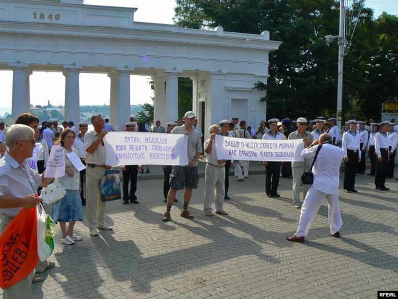 Житла чи грошей вимагали севастопольці на пікеті, виставивши плакати: «ЧФ РФ – флот безкарних злодіїв», «Путін, Медведєв, час вирішити проблему обдурених інвесторів», «Забувши про честь, совість і мораль, нас офіцери флоту обікрали», «Міняю любов до Росії на житло в Севастополі». Як повідомив Радіо Свобода ініціатор акції Олександр Добровольський, напередодні під час відвідин головнокомандувачем ВМФ Росії адміралом Володимиром Висоцьким російської школи №8 йому вдалось запитати у вищого військового чина, коли будівельне управління ЧФ добудує сплачене ними житло. Але відставного офіцера відтіснили охоронці. Потім адмірал робив вигляд, що не чує гучні запитання обдуреного пайовика.