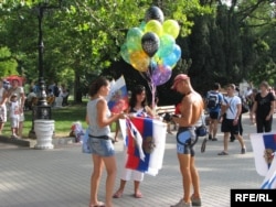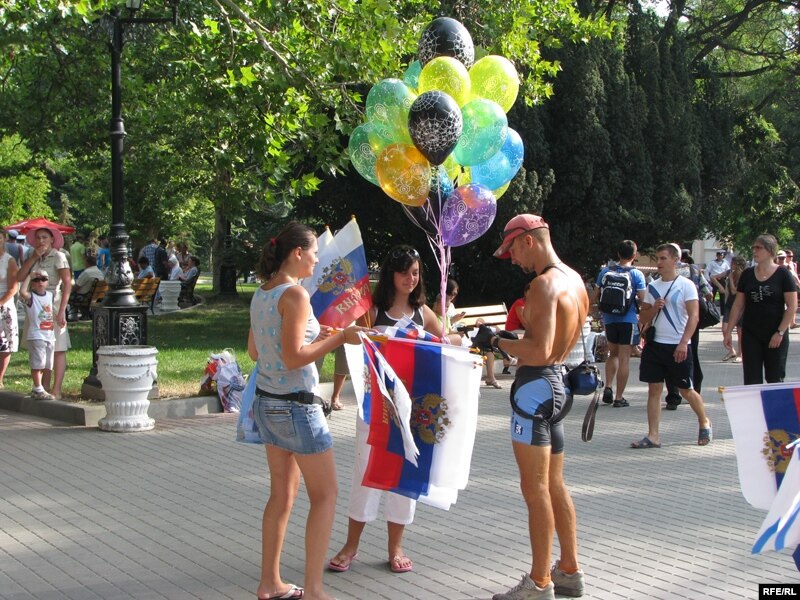 Продаж російських прапорів, поруч - квитків на трибуни. 26 липня 2009 р.