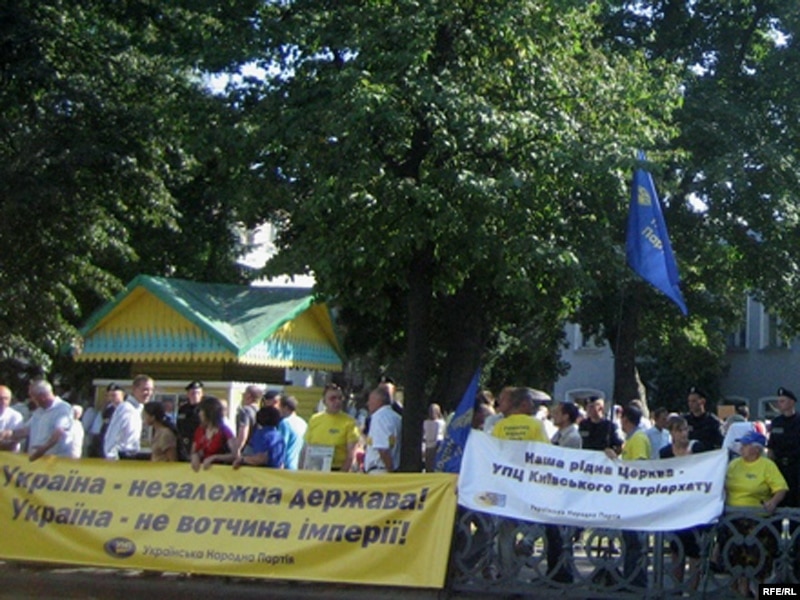 З обідньої пори центр Рівного поступово перетворювався у вулик – близько тисячі міліціонерів, кілька сотень священиків і черниць оточили центральний Свято-Воскресенський собор. Поряд, на майдані Незалежності, розташувалися намети «свободівців», між ними розміщені протестні плакати. Втім, самих «свободівців» тут - не густо, усі – під стінами собору. Тут їх підтримують представники Української народної партії, котрі нагадують патріархові, що Українська помісна церква – це не Московський патріархат. Втім, протестують тихо, з дозволу влади – каже керівник Рівненської організації партії «Свобода» Степан Мовчан: «Промосковські настрої в нашому місті й регіоні ще є, але з часом вони будуть меншими. Ми ж діяли в межах Конституції і законодавства України, і жодних силових дій не планувалося. Цим ми показали, що українці знають і вміють робити акції протесту».