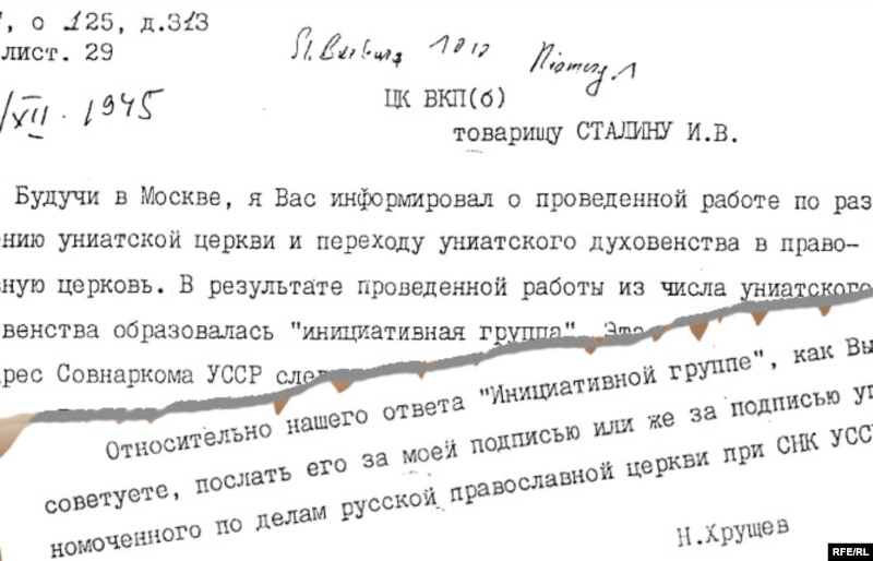 Днями в Австрії був оприлюднений невідомий раніше лист Микити Хрущова до Йосипа Сталіна. Цей документ датований 12 грудня 1945 року, коли Микита Хрущов очолював маріонетковий український уряд й містить пропозиції щодо способів знищення Української греко-католицької церкви (УГКЦ). Ми подаємо оригінал цього листа і український переклад: