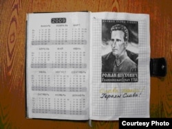 Втім, погляньмо на цю припалу пилом фальшивку. Тут оприлюднено «речові докази» участі «українських націоналістів» у воєнних діях у Південній Осетії, буцімто захоплені «російськими визволителями»: фотографії якихось людей у камуфляжному одязі і в масках, а також фотографію буцімто «блокнота унсовця». Зауважмо: на фотографії цей буцімто «блокнот українського націоналіста» з приклеєним портретом Головного командира УПА Романа Шухевича – російського виробництва, з російськомовним календарем. Під портретом Романа Шухевича – два рядки: «Слава Україні!» та «Героям слава!» Один рядок написано синім кольором, другий – жовтим. Не лише український націоналіст, а й будь-який громадянин України помітить, що в цій московській фальшивці кольори – «догори ногами»: жовтий – угорі, синій – унизу.