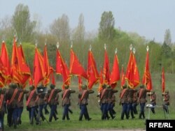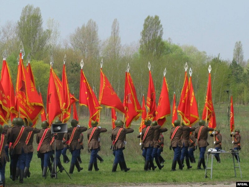 Летовище заводу «Авіант» у Києві. До обрію вишикувалися лави військових та бойова техніка, повторюючи обриси Хрещатика та майдану Незалежності, де відбуватиметься парад. Над військовими майорять українські, російські та білоруські державні прапори, але більше – червоних прапорів із радянською символікою. За словами організаторів, це точні копії оригінальних бойових штандартів Другої світової.