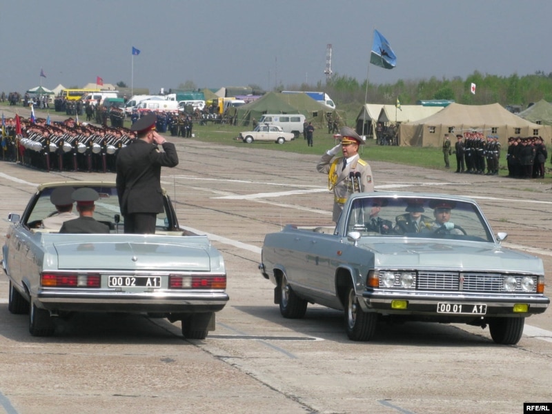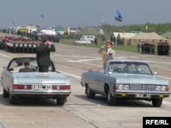 Готовність вояків перевіряє керівник параду, головнокомандувач Сухопутних військ України Геннадій Воробйов. Він зупиняється біля солдатів Росії, які прибули для участі у параді.