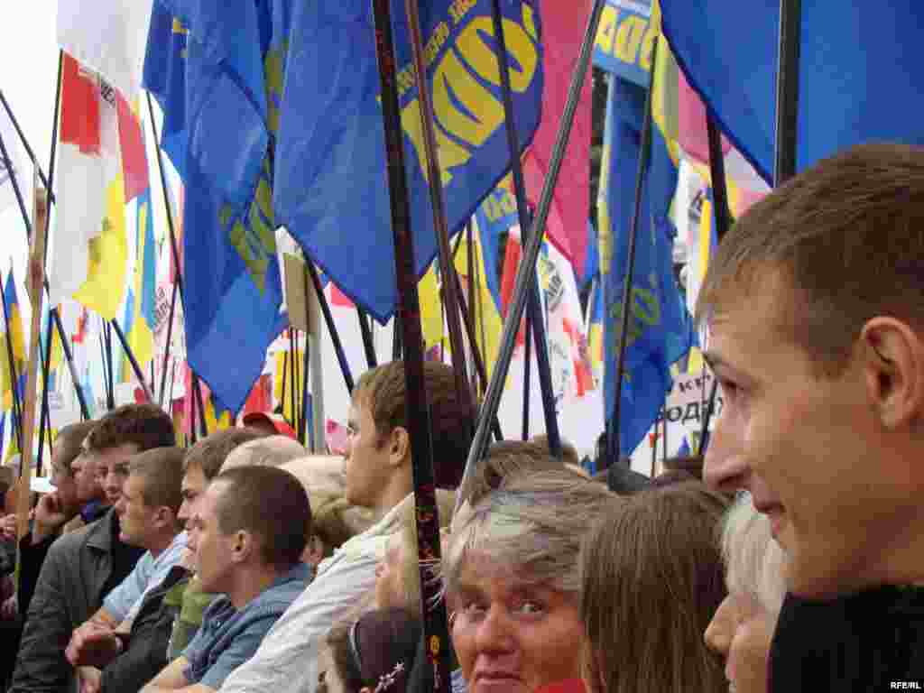 Учасники мітингу тримають у руках прапори із символікою Блоку Юлії Тимошенко, партій «Всеукраїнське об’єднання «Свобода», «Народний рух України», а також національні та прапори інших організацій.