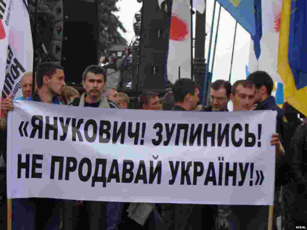Демонстранти також розгорнули транспаранти з написами: «Янукович, батьками і батьківщинами не торгують!», «Янукович, зупинися! Не продавай Україну!»