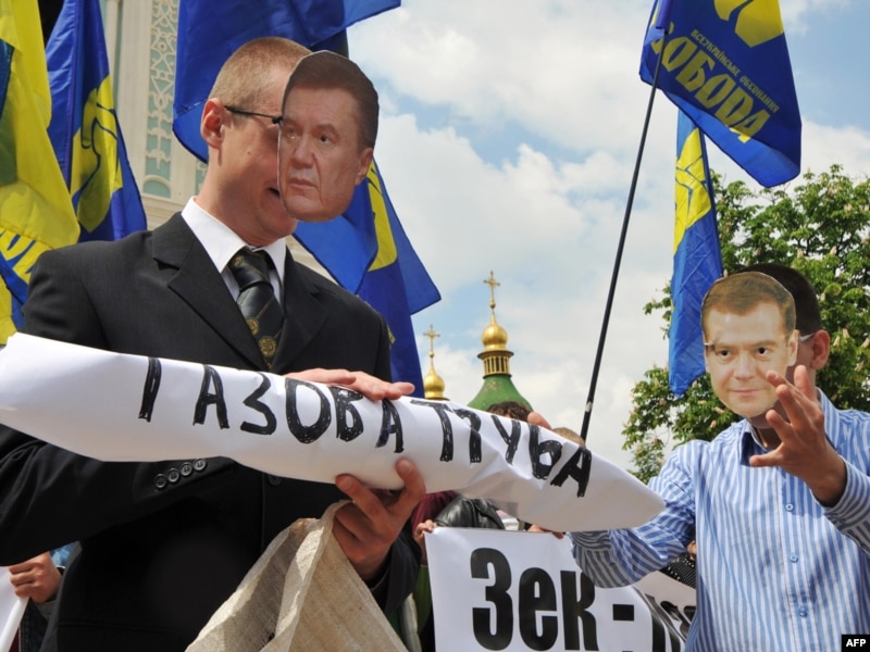 Напередодні суд заборонив проведення акцій протесту по маршруту слідування президента Росії. Тож близько сотні активістів партії «Свобода» зібралися на Софійському майдані столиці, де влаштували перфоманс на тему здачі національних інтересів.