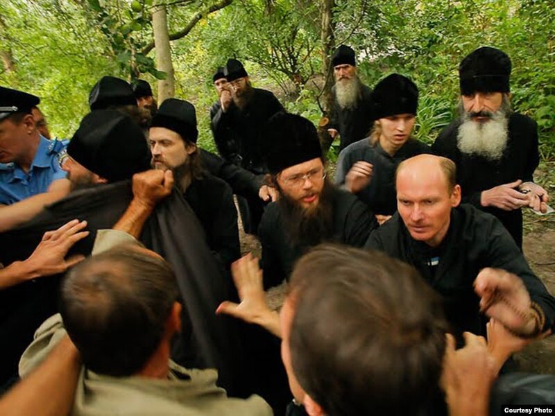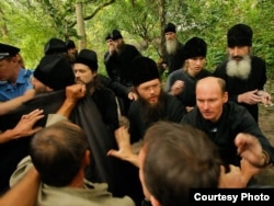 Ченці у Свято-Троїцькому монастирі вдалися до сили, щоб узяти під контроль будинок, вересень 2009 року (фото: Олександр Калашников)