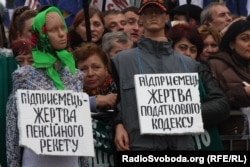 У руках у мітингувальників – прапори профспілкових організацій, жовто-сині стяги та саморобні транспаранти. На більшості з них – написи: «Ні податковому терору», «Ми – не раби», «Азаров-геолог знайшов золоту жилу в кишенях бізнесу», «Зміни до податкового кодексу – це мільйони безробітних», «Малому бізнесу риють могилу. То, може, треба готувати вила?»