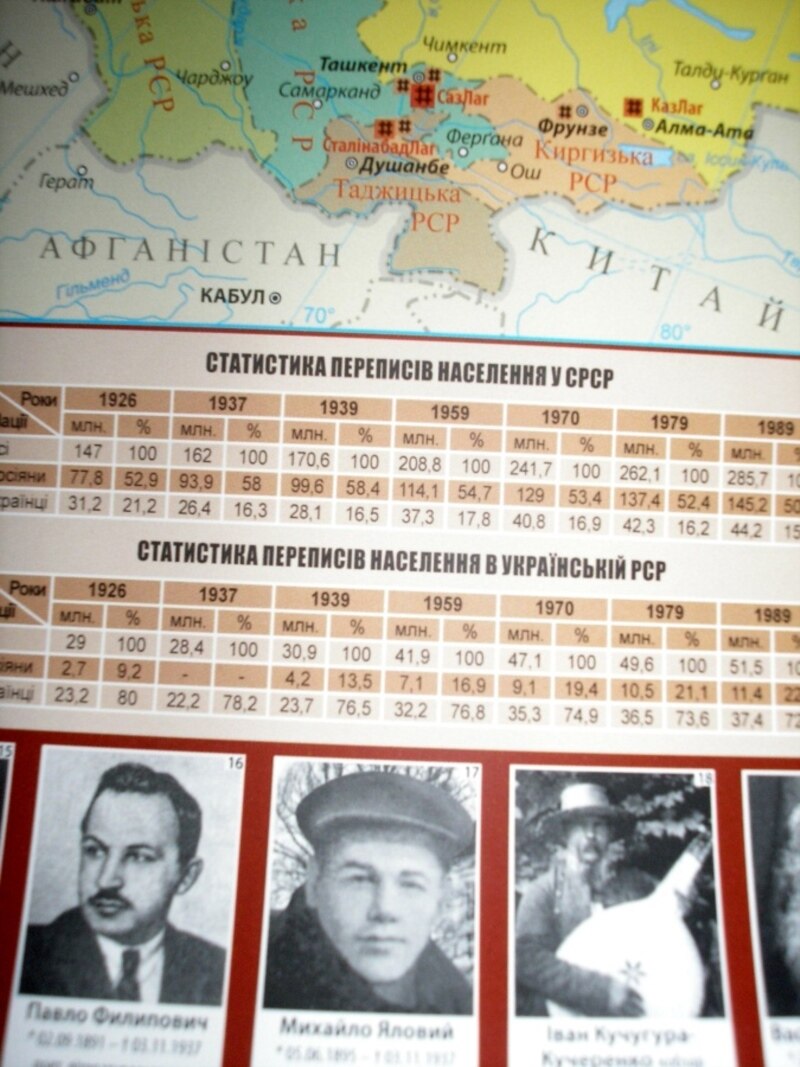 Проти українців застосовувались різні форми репресій: ліквідація політичних лідерів, нищення у тюрмах, у концтаборах, голодом, втягуванням у війни, депортації та імміграції, руйнування культури, духовності, русифікація і моральний терор, згадано на мапі.