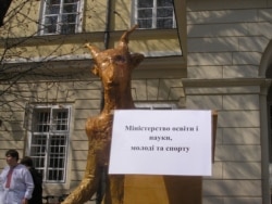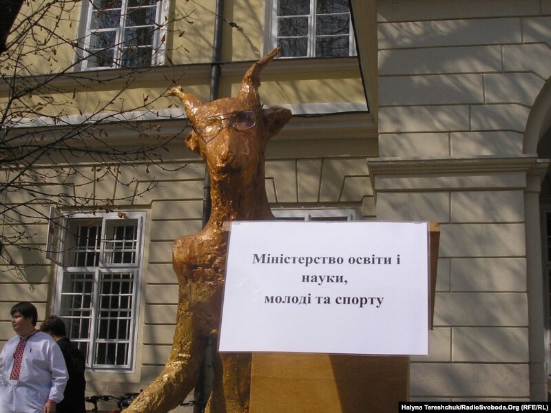 А ось у Львові з гіпсу зліпили пам’ятник козла в окулярах, який стоїть за кафедрою. Автор проекту Ольга Сало розповіла в коментарі Радіо Свобода, що саме ця тварина асоціюється у неї з відсутністю якісних реформ в освіті, а вся діяльність міністра спрямована на деградацію освіти.