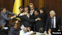 Київ – Розгляд законопроекту «Про засади державної мовної політики» завершився у четвер не голосуванням, а великою бійкою між депутатами. Через це спікер закрив засідання. Опозиціонери наголошують, що цей законопроект фактично заперечує державний статус української мови на користь російської. Натомість депутати-регіонали наполягають на тому, що законопроект відповідає Європейській хартії регіональних мов.