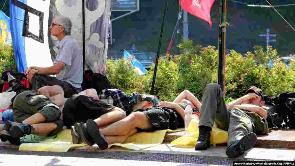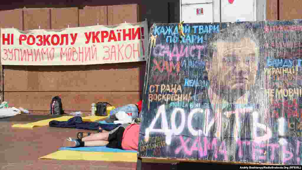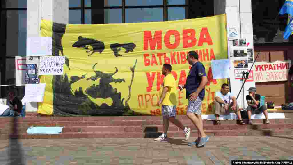 Кількасот людей у Києві продовжують акцію біля Українського дому – на знак протесту проти ухвалення Верховною Радою закону «Про засади державної мовної політики». На Європейській площі столиці протестувальники пережили вже третю ніч.