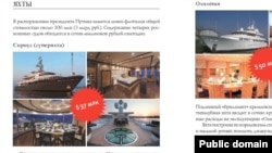 Доповідь включає в себе фотографії президентської резиденції, літаків, яхт і автомобілів.