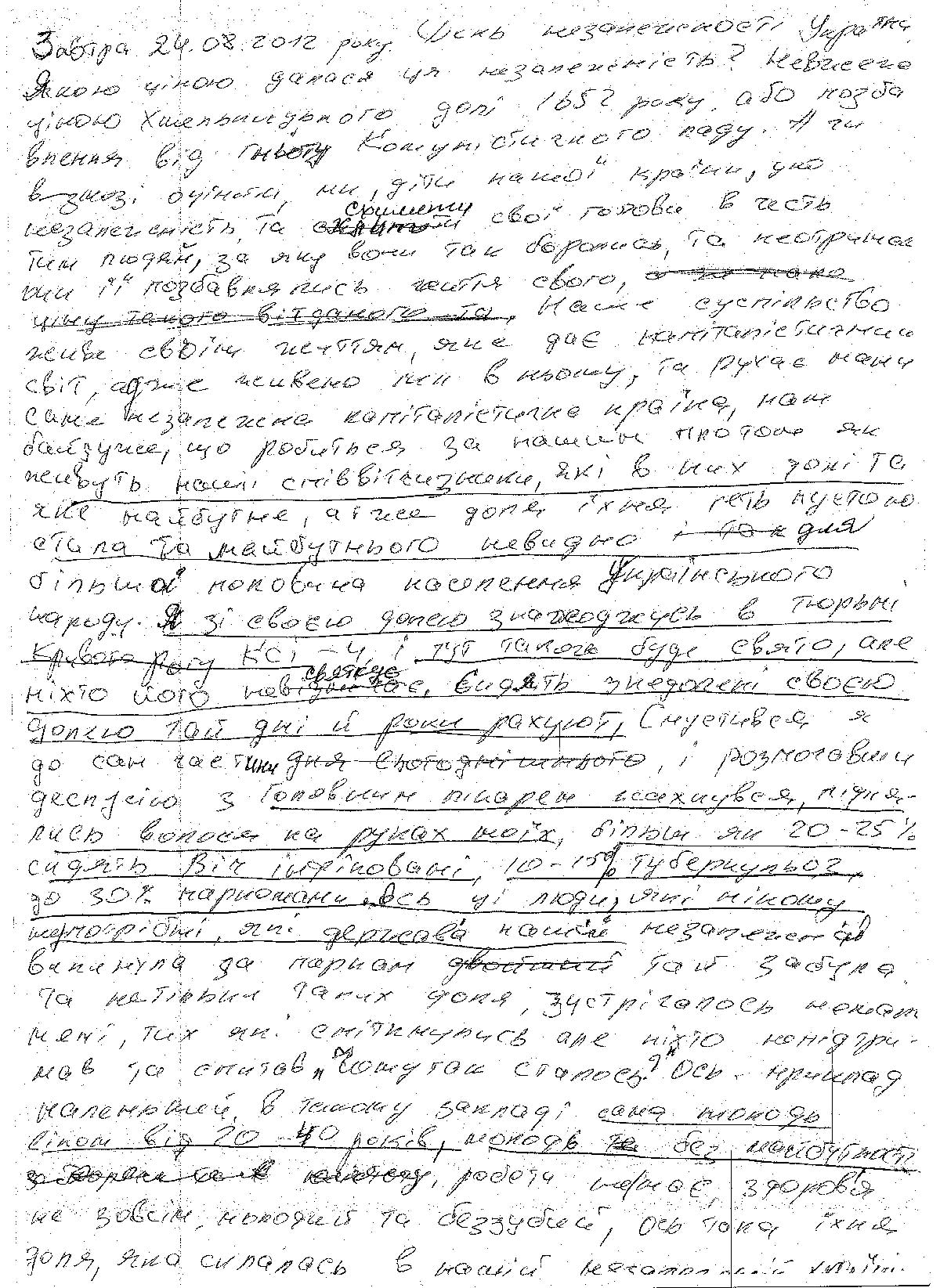 Умови катастрофічні! Мої батьки не повернулися з Караганди, брат працював прокурором Івано-Франківської області, робив розкопки у «Дем’яновому Лазу» – і я ніколи не думала, що у нас в незалежній Україні таке утримання ще не засуджених людей, таке ставлення до людей. І це таке на 21-й рік нашої незалежної України! Це для мене жахливо!