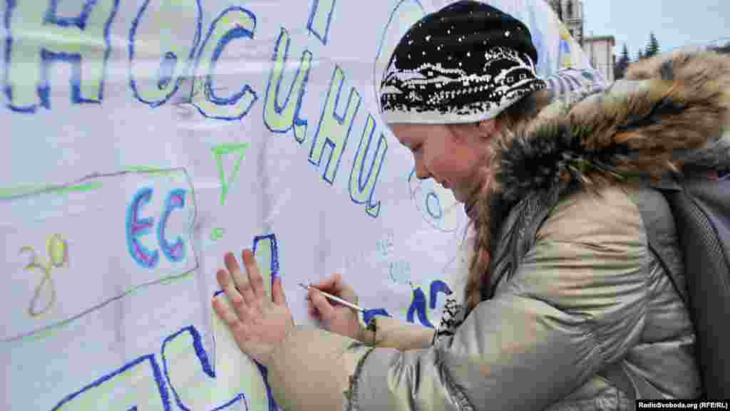 12-річна Оксана Паляниця пише «ЄС – це наше мабйтнє» на полотні біля Львівської Політехніки