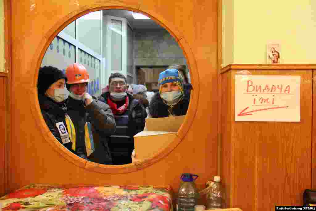 Їдальня Будинку профспілок – основна кухня Євромайдану, не припиняє працювати ні вдень, ні вночі. Сюди зносять продукти, які привозять люди, тут їх сортують і готують з них їжу , двічі на день нові гарячі страви і майже постійно – бутерброди, чай, кава