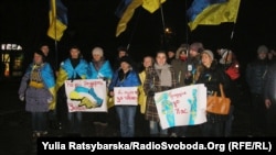 У руках вони тримали синьо-жовті та червоно-чорні прапори, а також плакати з написами «Не дай роздерти Україну», «Приєднуйся до нас», «Ми тут за чесність» тощо, повідомляє кореспондентка Радіо Свобода.