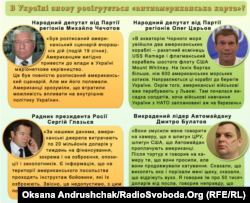 «Це робиться для того, щоб відволікати людей від реальних причин того, що відбувається, – пояснює Пушкар. – Мовляв, країну у нас не розікрали, правова система у нас діє чудово, а людей на Грушевського не повбивали, а просто у всьому винні американці. Є ж зовсім протилежні дані, що люди з близького оточення Януковича тісно пов’язані з Кремлем».