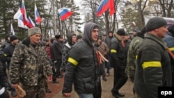 Далі – більше. Досі за правилами сепаратистського шулерства в Криму намагаються доводити, що вишколені автоматники в професійній уніформі – це якісь невідомі захисники кримчан від «екстремізму» або «активісти самооборони Криму». При цьому на практиці це виглядає так: журналістів люб’язно допускають знімати ззовні заблоковану українську частину, по периметру якої мало не під кожним кущем стоїть по автоматнику все так само без розпізнавальних знаків. Підхід до КПП цієї частини блокують народні ополченці з місцевого населення. Бідно вдягнені, невпевнені в розмові чоловіки кажуть, що поставлені на підмогу бравим автоматникам задля уникнення провокацій. Окупаційним військам ці ополченці скандують «Росія!» Поміж них курсує «місцевий активіст», що сильно виділяється з-поміж справжніх місцевих: вартість одного його костюму може дорівнювати річному доходу місцевих мешканців. Він вільно розмовляє кількома європейськими мовами й активно роздає коментарі західним журналістам, виправляючи їх, що йдеться не про «українську» частину, а «кримську». Саме кримську. При цьому заблоковані українські офіцери, яких ці панове, «приставлені» до ополченців, намагаються видати за силовиків, які ось-ось перейдуть на бік сепаратистів, телефонують і кажуть: «У нас хотіли забрати зброю, ми не віддали, кажуть, будуть вночі штурмувати. Просто знайте на всяк випадок, що ми стоїмо до кінця».