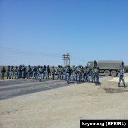 Трасу Армянськ-Херсон блокували чотирма смугами з автомобілів УРАЛ, БТР, а також бійцями ОМОН і інших силових спецпідрозділів Росії.