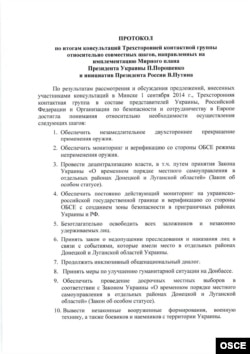 Організація з безпеки і співпраці в Європі оприлюднила в ніч на неділю текст Протоколу за результатами консультацій тристоронньої контактної групи щодо спільних кроків, спрямованих на імплементацію мирного плану президента України Петра Порошенка та ініціатив президента Росії Володимира Путіна, підписаний у п’ятницю в Мінську.