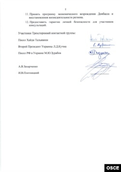 За результатами розгляду і обговорення пропозицій, внесених учасниками консультацій у Мінську 1 вересня 2014 року, Тристороння контактна група у складі представників України, Російської Федерації і Організації з безпеки і співпраці в Європі досягла порозуміння щодо необхідності здійснити такі кроки: