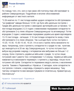 У цьому ж сюжеті повідомляють, що так звані «ополченці» змушені відкривати вогонь у відповідь, проте весь час зберігають перемир’я і першими не атакують ніколи. А от як про події 16 листопада пише Роман Бочкала. За словами одного з мешканців, починаючи з 16 листопада, сепаратисти почали обстрілювати другу лінію оборони Северодонецька. І лише тоді українська сторона відкрила вогонь у відповідь. Місцевий мешканець також вказує на тактику сепаратистів: постріляти і поїхати, а відповідь отримують мирні мешканці. Підтвердженнями такої тактики раніше був сюжет російського «1-го каналу», коли журналісти відзняли, як так званий «ополченець» стріляє просто з житлового будинку.