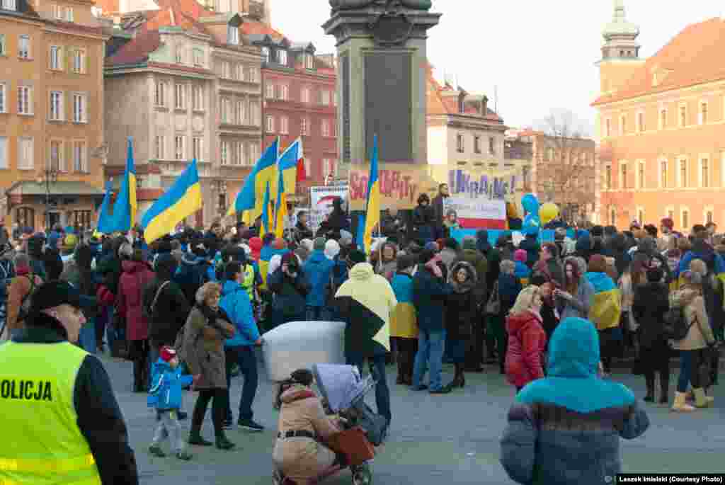 Кілька сотень учасників пройшлися центром столиці Польщі, щоб висловити підтримку українцям та віддати шану загиблим біля дошки пам’яті під посольством України у Варшаві. (Фото надані фундацією «Відкритий діалог»)