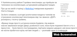 «Як такого штурму там не було, просто вийшло що в цей момент зібралося там безліч людей. В принципі людьми опанувало нетерпіння, зіграла роль колективного мислення, коли люди, так сказати, несвідомо кинулися туди. На вході були пошкоджені вхідні двері, пошкоджено скло, усередині нікого з озброєних бійців республіки не було. Там знаходився персонал пенсійного фонду. Я не писав, що там були бойовики або були озброєні люди», – прокоментував Микита Синіцин для Радіо Свобода.