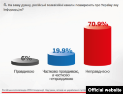Жителі України у більшості переконані, що російські телеканали поширюють неправдиву інформацію про ситуацію в Україні: у західних та центральних областях так вважають 86%, у південних – 63%, на сході – 43%.