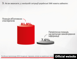 Абсолютна більшість (82%) опитаних переконані, що українські медіа мають займати не патріотично-пропагандистську позицію, а об’єктивно висвітлювати ситуацію в країні, розповідати як про успіхи, так і помилки українських військових і влади.