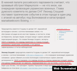 «Леонід Слуцький, голова комітету Держдуми у справах СНД, євразійської інтеграції і зв’язків зі співвітчизниками: «Обстріл в Маріуполі – це чергова провокація українських силовиків з метою звинуватити у всьому ополченців і остаточно зірвати Мінські домовленості. ОБСЄ встановила, що снаряди летіли з боку українських позицій, проте цих даних воліють не помічати, перевертаючи все з ніг на голову, і знову в усьому бачать руку Москви», – пишуть на сайті каналу «НТВ».