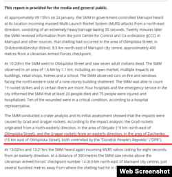 Російські канали неохоче цитують звіт ОБСЄ, в якому мовиться про те, що 24 січня місто Маріуполь обстріляли з територій, підконтрольних так званій «ДНР» – організації, яку в Україні визнано терористичною. А деякі російські канали навіть зазначають, що в звіті, буцімто, написано, що снаряди прилетіли з боку позицій, які займають українські силовики – це не відповідає дійсності.