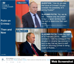 Так, на фотоколажі на сторінці посольства Великої Британії у Twitter демонструють відповідь Путіна на запитання «Як ви бачите майбутнє Криму? Чи розглядаєте ви можливість приєднання його до Росії?».