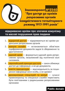 – З деяких конкретно пунктів: питання доступу до архівів. Як це буде зроблено в Україні? Чи це буде так, як ось, скажімо, в Німеччині – архіви «Штазі» стали доступними для всіх. Чи це буде трошки складніше?