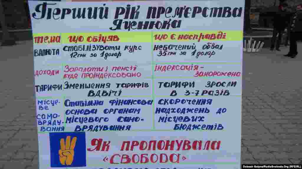 На Вічевому майдані в центрі Івано-Франківська «Студентська Свобода» провела акцію «Рік діяльності уряду». На спеціальних стендах активісти виписали і протиставили, що обіцяв уряд Арсенія Яценюка і що зроблено у різних сферах діяльності, зокрема щодо санкцій проти Росії, проекту «Стіна», впровадження реформ в країні, їхнього впливу на податки, тарифи, валюту, місцеве самоврядування. За їхніми словами, цією акцією вони хотіли показати, що за рік у країні нічого не змінилося.