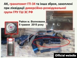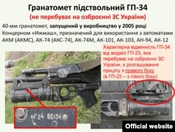СБУ також продемонструвало автомат Калашникова із підствольним гранатометом ГП-34. За словами радника голови СБУ Маркіяна Лубківського, такий гранатомет не використовується в українській армії та сильно відрізняється від української моделі.