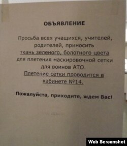 «Прохання до всіх учнів, вчителів, батьків, приносити тканину зеленого, болотного кольору для плетіння маскувальної сітки для воїнів «АТО», - написано в оголошенні.
