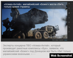 «За основною версією російського концерну «Алмаз-Антей», який увесь цей час буквально по крихтах збирав інформацію про катастрофу Боїнга, лайнер був збитий із землі зенітною керованою ракетою, випущеною з комплексу «Бук М-1». Саме такий тип озброєння має у своєму розпорядженні українська армія. Фахівці ретельно вивчили ушкодження обшивки. Аналіз даних дозволив говорити і про можливе місце пуску. І це зовсім не Сніжне, на який вказувала українська сторона, намагаючись звинуватити у всьому «ополченців», а населений пункт, де в той момент були київські силовики».