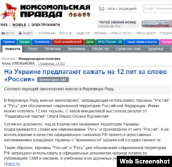 «В Україні запропонували позбавляти волі на 12 років за використання слів «Росія» і «Русь» для позначення території сучасної Російської Федерації в офіційних документах та в ЗМІ, а також на дорожніх покажчиках і в рекламі. Про це йдеться в законопроекті, опублікованому на сайті Верховної Ради», – йдеться у новині на сайті видання «Лента.ру».