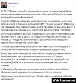 «У вівторок, 14 липня, з’явилася інформація, що в ніч на понеділок в Києві розстріляли незалежну журналістку Маргариту Валенко, яка була супротивницею нацистського розвитку України. За деякими даними, кілер чекав на 26-річну дівчину прямо біля дверей її квартири, а коли та повернулася додому, випустив у неї три кулі», – йдеться у повідомленні на порталі видання «Комсомольская правда».