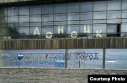 Патриоты «ДНР» сверху нанесли свой слоган: «ДОНЕЦК РУССКИЙ ГОРОД!», а недавно сторонники Украины дописали снизу: «НЕНАВИДИТ РАШИСТСКИХ ОККУПАНТОВ!»