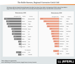Російський рубль зазнав за півтора роки драматичного падіння – із 32 рублів за долар на початку минулого року до 69 рублів за долар цього місяця. І хоча втрачають в ціні й валюти нових незалежних держав – колишніх радянський республік, однак чи варто перебільшувати вплив на падіння гривні, чи грошових одиниць Грузії, Молдови, Азербайджану, Казахстану саме фактору російського рубля? Чи справді рубль аж так тягне за собою нові валюти сусідів?