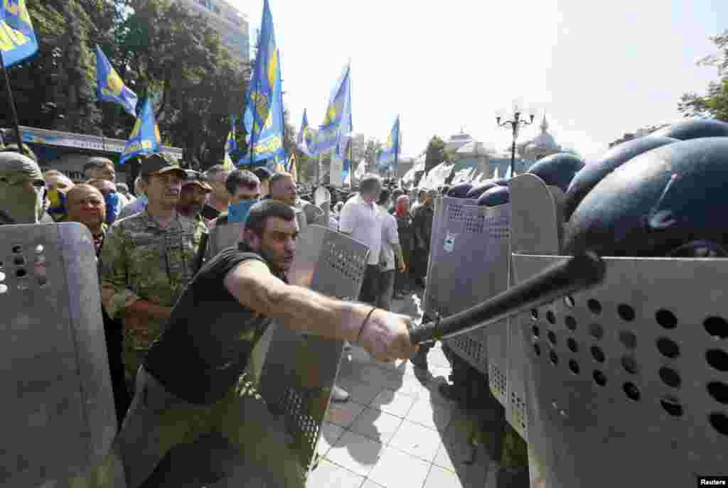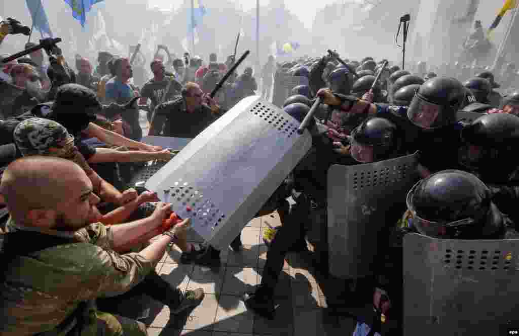 Під стінами українського парламенту в Києві 31 серпня виникли сутички після того, як Верховна Рада підтримала в першому читанні зміни до Конституції щодо децентралізації. Протестувальники почали наступ на будівлю Верховної Ради, яку охороняв кордон правоохоронців. За повідомленням МВС України, поранені близько 100 правоохоронців, 10 – у тяжкому стані. Міністр внутрішніх справ України Арсен Аваков підтверджує інформацію про те, що внаслідок поранень, отриманих під час сутичок біля Верховної Ради, помер боєць Нацгвардії.