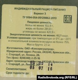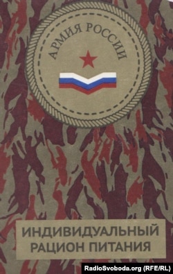 Надо сказать, что вся еда упакована в картонные коробки и на каждой коробке имеется надпись: «Индивидуальный рацион питания». Чуть выше написано «Армия России», пятиконечная звезда и флаг Российской Федерации. Ну, тот самый, на котором белые сверху, красные снизу, а между ними голубые.