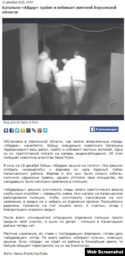 «У ніч на 18 грудня бійці «Айдару» вийшли на «полювання». Вони вирішили відібрати мікроавтобус у фермера з села Червоний Чабан Каланчацького району. Фермер і його син були сильно побиті, отримали серйозні травми, проте відстояли своє майно. На нападників написали заяву в поліцію», – повідомляє канал Міноборони Росії «Звезда» із посиланням на сайт NewsFront.